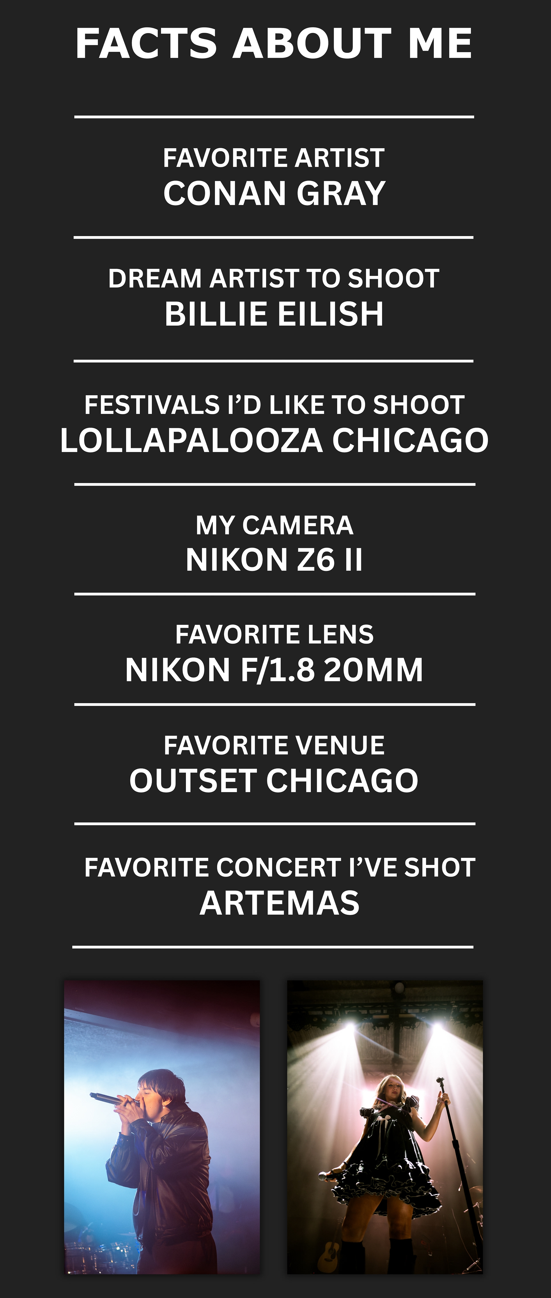 Hi, I’m Emma C, a concert photographer based in Chicago, Illinois. My love for concerts inspires me to capture the energy and artistry of every performance. I’m passionate about preserving the connection between artists and fans, and I’m excited to continue growing and sharing the magic of concerts through my lens.